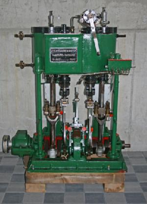 Zweizylinder Schiffsdampfmaschine gebaut von der "Maschinenfabrik und Kesselschmiede, Eisen- und Metallgießerei Christiansen & Meyer" in Hamburg - Harburg im Jahr 1940.